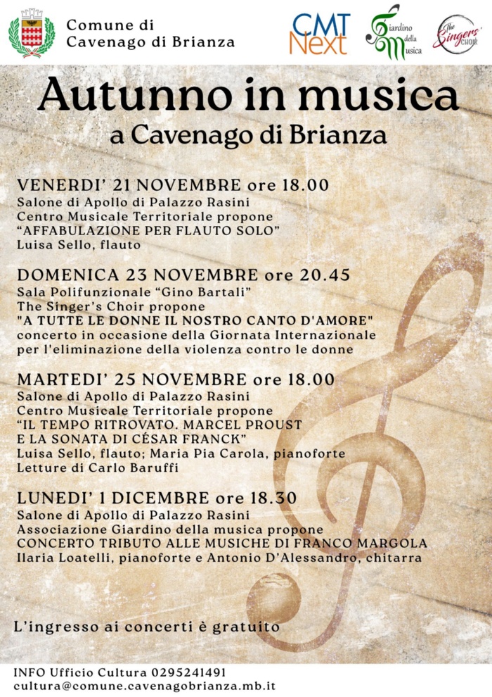 Il Comune di Cavenago di Brianza presenta Autunno in Musica, una rassegna di appuntamenti musicali gratuiti che accompagneranno la cittadinanza dalla seconda metà di novembre fino ai primi giorni di dicembre. Concerti, letture e omaggi musicali animeranno diversi spazi culturali del paese, con la partecipazione di importanti realtà locali.
