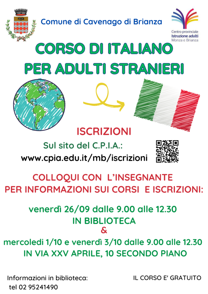 Il Comune di Cavenago di Brianza, in collaborazione con il Centro Provinciale per l' Istruzione degli Adulti, organizza anche quest'anno un corso di lingua italiana per stranieri adulti.