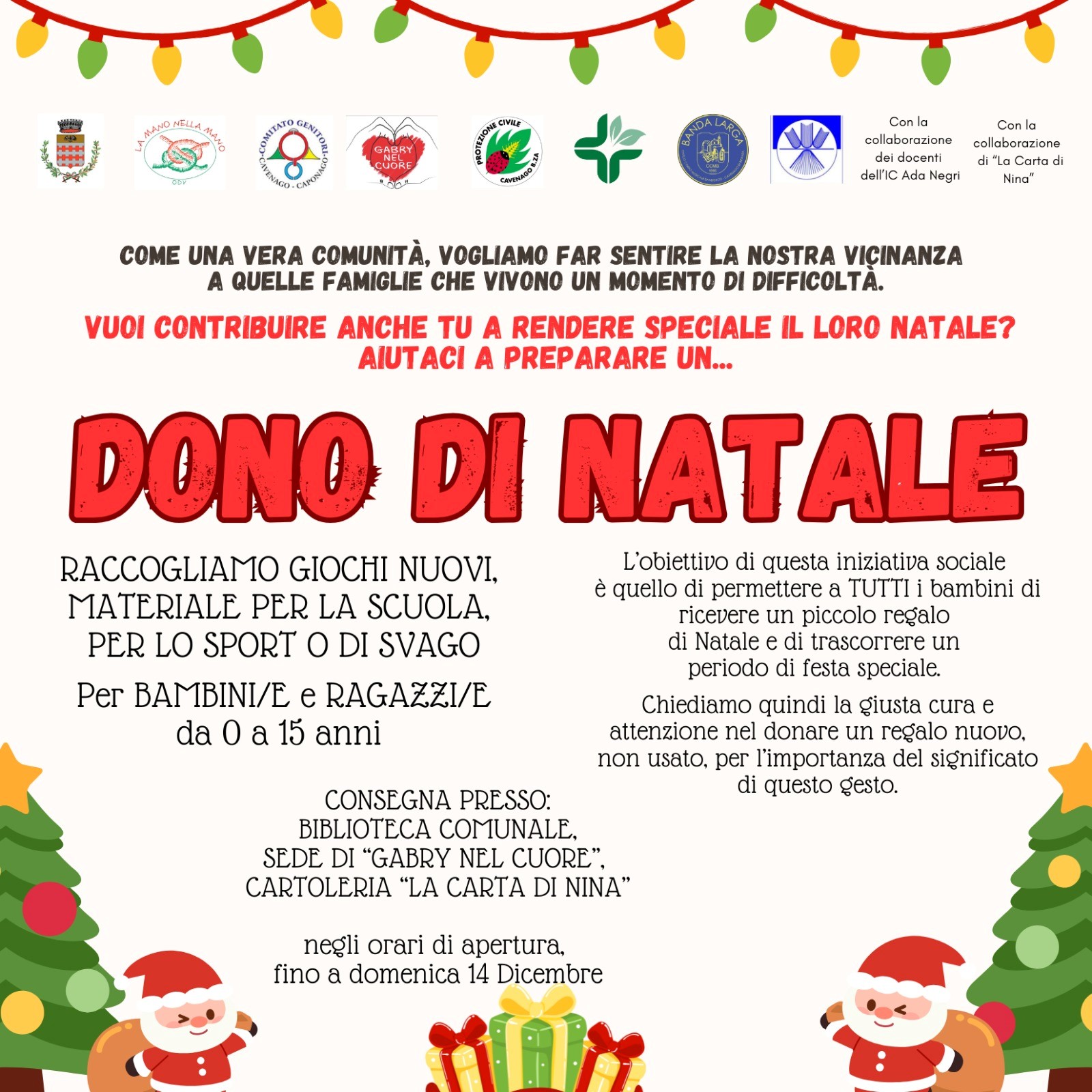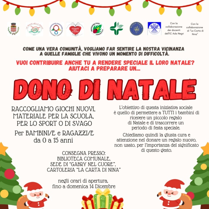 l Comune di Cavenago di Brianza, insieme alle associazioni locali e con la collaborazione dei docenti dell’IC Ada Negri e della cartoleria “La Carta di Nina”, promuove l’iniziativa “Dono di Natale”: un progetto solidale per portare un sorriso ai bambini e ragazzi di famiglie che stanno attraversando un momento di difficoltà.