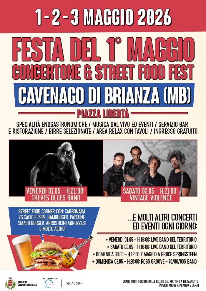 Il weekend dell'1-2-3 Maggio 2026 va in scena anche quest'anno un'attesa tre giorni di Festa del 1° Maggio in Piazza Libertà a Cavenago di Brianza (MB), con tanti eventi e concerti tutti i giorni, un gustoso street food corner da leccarsi i baffi, divertimento per tutte le età!