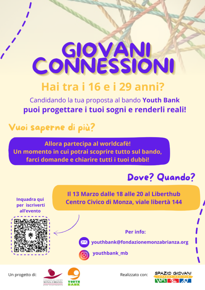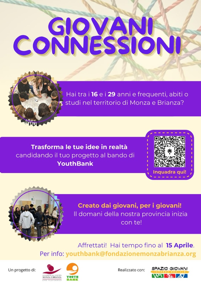 È il bando scritto dagli Youth Banker con l’aiuto di Spazio Giovani e FCMB “con l’intento comunedi integrare i giovani nella loro comunità e renderli protagonisti attivi del loro futuro”,finanziando progetti che si impegnano a portare un cambiamento nella comunità.