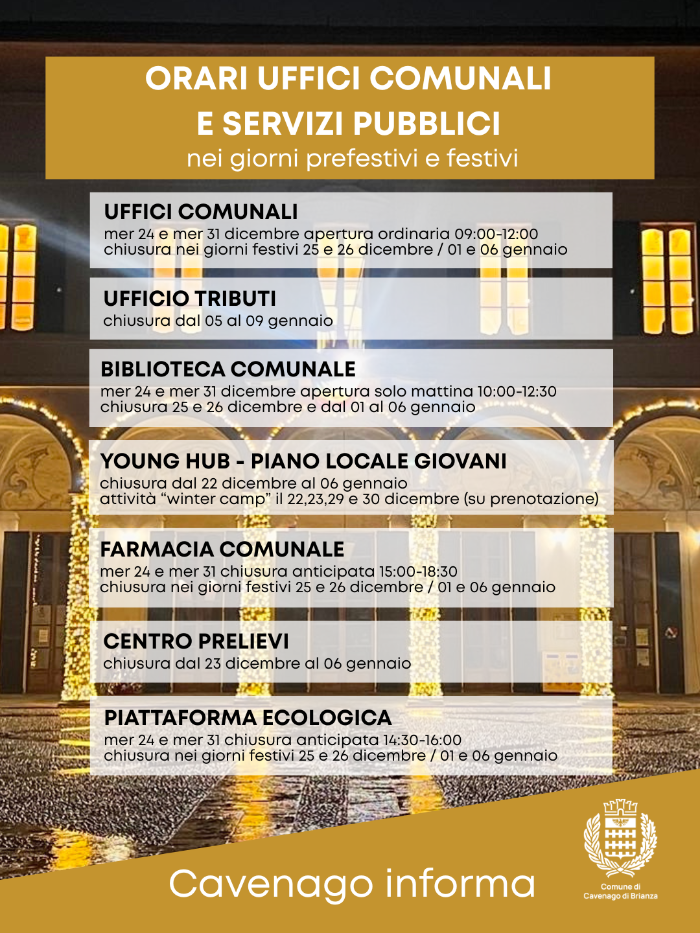 Si informa la cittadinanza che, in occasione delle festività natalizie e di inizio anno, gli orari di apertura degli uffici comunali e dei servizi pubblici subiranno le seguenti variazioni.