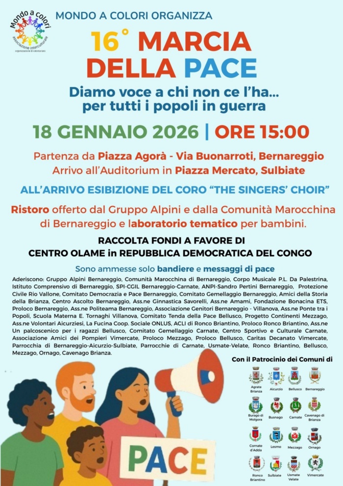 Il Comune di Cavenago di Brianza, insieme ad altri Comuni del territorio, è lieto di patrocinare e sostenere la 16ª Marcia della Pace, organizzata dall’associazione Mondo a Colori e in programma domenica 18 gennaio 2026 alle ore 15:00.