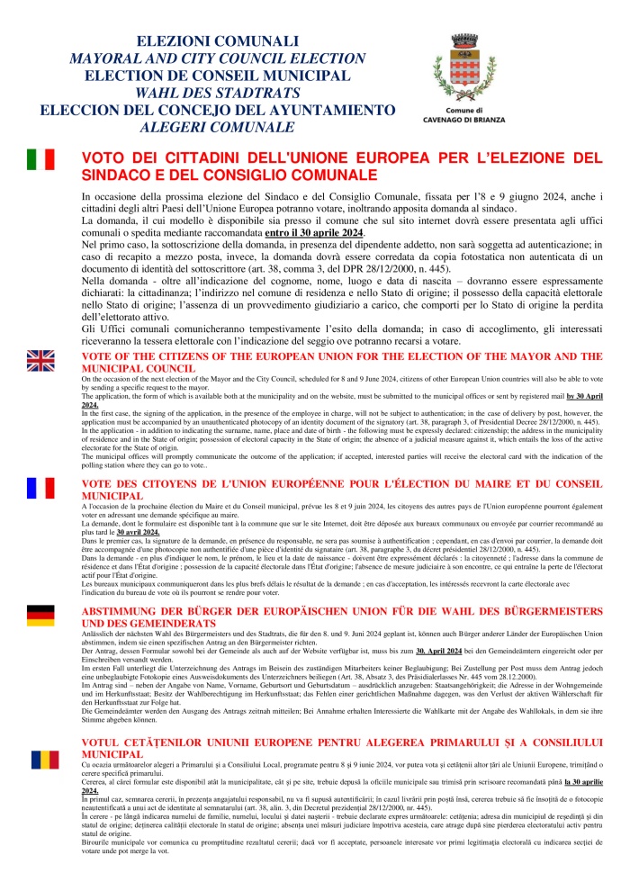 I cittadini di uno Stato dell’Unione Europea residenti in Italia che intendono esercitare il diritto di voto in occasione delle elezioni comunali previste per il mese di giugno 2024 devono presentare al sindaco del Comune italiano di residenza la domanda per l’iscrizione nell’apposita lista elettorale aggiunta, relativa a tali consultazioni - istituita presso il Comune stesso - entro il 30 aprile 2024.