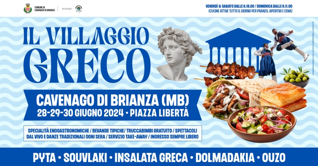 Con l'arrivo dell'Estate, il weekend del 28-29-30 Giugno 2024 nuovo appuntamento enogastronomico a Cavenago di Brianza (MB) con la 43° edizione de "Il Villaggio Greco", il format itinerante dedicato alla Cucina e alla Cultura del Peloponneso: tre giornate di gusto e divertimento da non perdere - tra cibo greco, musica e danze tradizionali, birra fresca, bevande tipiche, intrattenimento per tutte le età, relax e molto altro - presso la centrale Piazza Libertà!