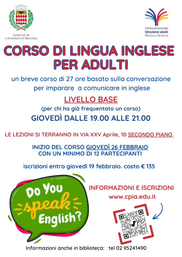 L' Amministrazione Comunale e il Centro Provinciale Istruzione Adulti (CPIA) propongono alla cittadinanza un corso di inglese per adulti, breve e basato sulla conversazione per imparare e migliorare la propria comunicazione in lingua.