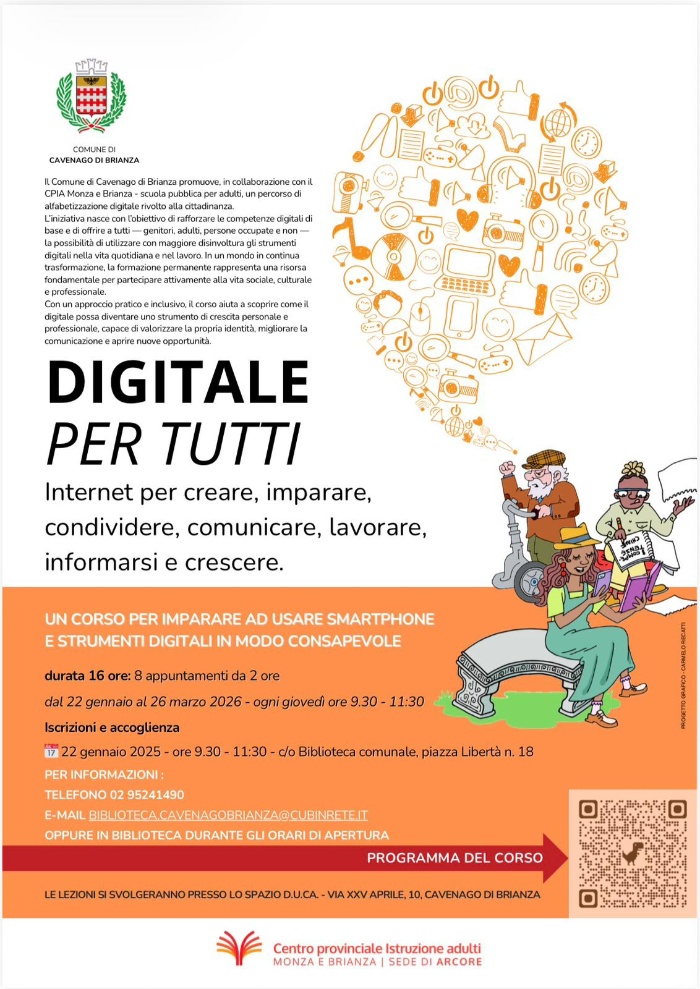Il Comune di Cavenago di Brianza promuove, in collaborazione con il CPIA Monza e Brianza - scuola pubblica per adulti, un percorso di alfabetizzazione digitale rivolto alla cittadinanza.