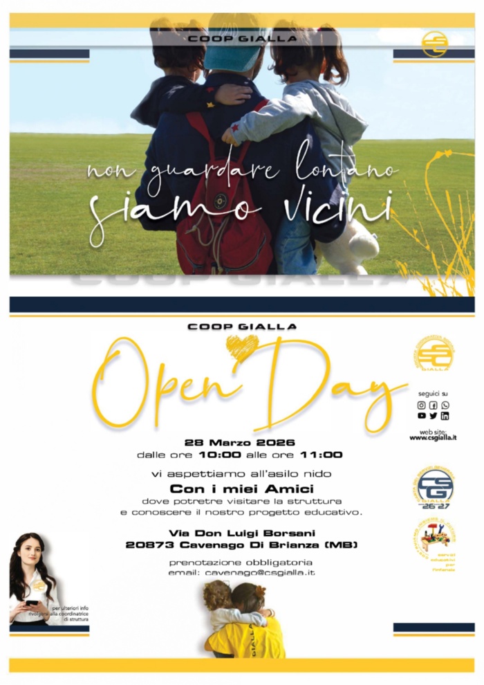 Si terrà sabato 28 marzo 2026, dalle ore 10:00 alle ore 11:00, l'Open Day presso l'asilo nido "Con i miei Amici". L'iniziativa, organizzata da Coop Gialla, è dedicata alle famiglie che desiderano conoscere da vicino gli spazi e l'offerta educativa rivolta ai più piccoli.