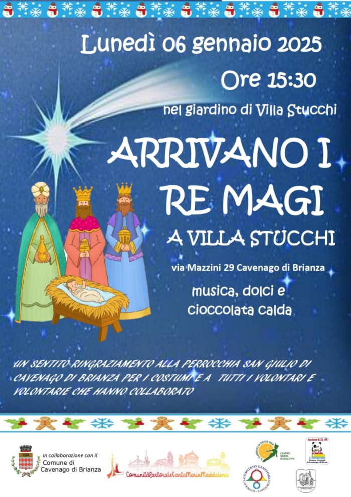Descrizione Arrivano i Re Magi a Villa Stucchi. Musica, dolci e cioccolata calda con l'Associazione D.U.Ca. nel giardino di Villa Stucchi dalle ore 15.30