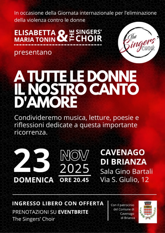 In occasione della Giornata Internazionale per l'eliminazione della violenza contro le donne, l'associazione The Singers' Choir, con il Patrocinio del Comune di Cavenago di Brianza, invitano alla serata: "A tutte le Donne il nostro canto d'amore".
