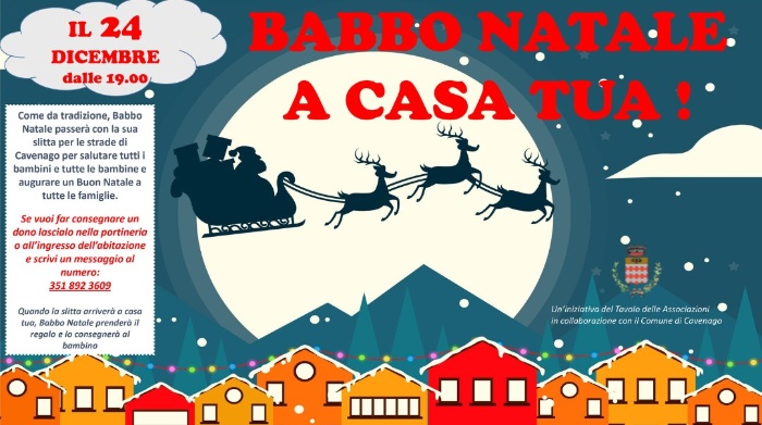 Anche quest’anno il Tavolo delle Associazioni in collaborazione con il Comune di Cavenago propone per la sera del 24 dicembre l’iniziativa BABBO NATALE A CASA TUA!