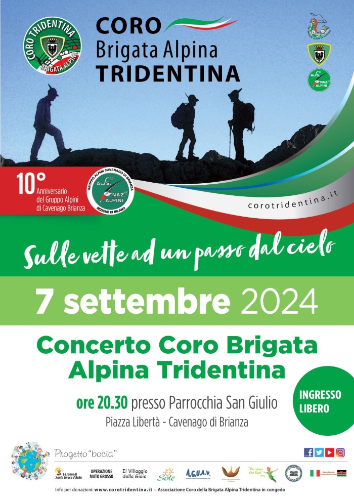 Gruppo Alpini Cavenago di Brianza propone, nell'anno del 10°anniversario, il concerto "sulle vette ad un passo dal cielo" il 7 Settembre alle ore 20.30 presso la Parrocchia di San Giulio