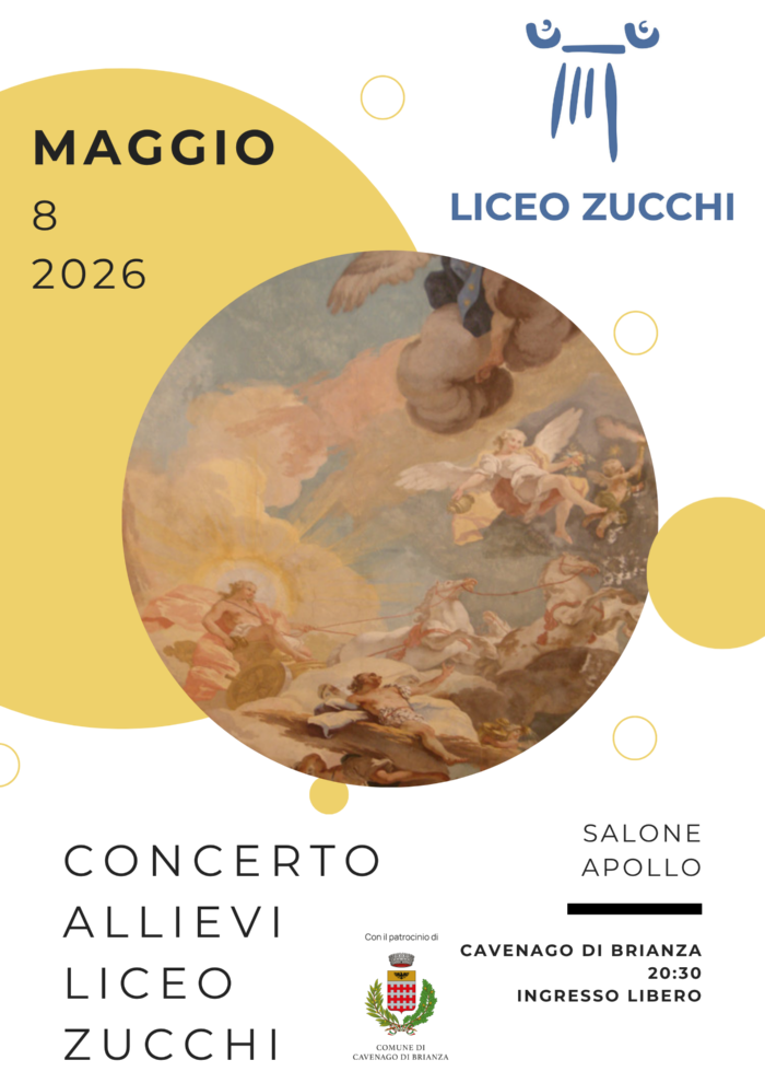 Venerdì 8 maggio 2026, presso la suggestiva cornice del Salone Apollo, si terrà il Concerto degli Allievi del Liceo Zucchi. La serata offrirà un programma variegato e coinvolgente, frutto dello studio e della passione degli studenti delle classi di: