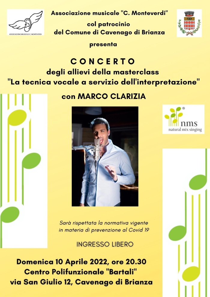 Domenica 10 Aprile alle ore 20.30 presso la sala polifunzionale Gino Bartali in Via San Giulio, concerto conclusivo degli allievi della masterclass "la tecnica vocale al servizio dell'interpretazione" a cura dell'Associazione Monteverdi con il patrocinio del Comune aperto gratuitamente a tutti i cittadini.