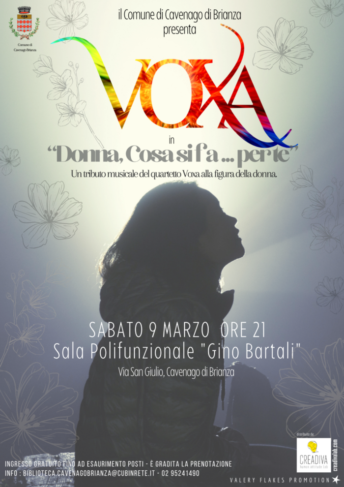Dai Cetra ai Bee Gees, da Cocciante ai Manhattan Transfer, dai Cugini di Campagna a Fred Buscaglione, il quartetto Voxa dedica un tributo alla figura femminile con uno spettacolo che attraversa vari generi e stili musicali nel corso del tempo, dai brani più ricercati a quelli che più comunemente si ricordano come “canzonette” d’altri tempi ma che ancora oggi muovono gli affetti di varie generazioni.