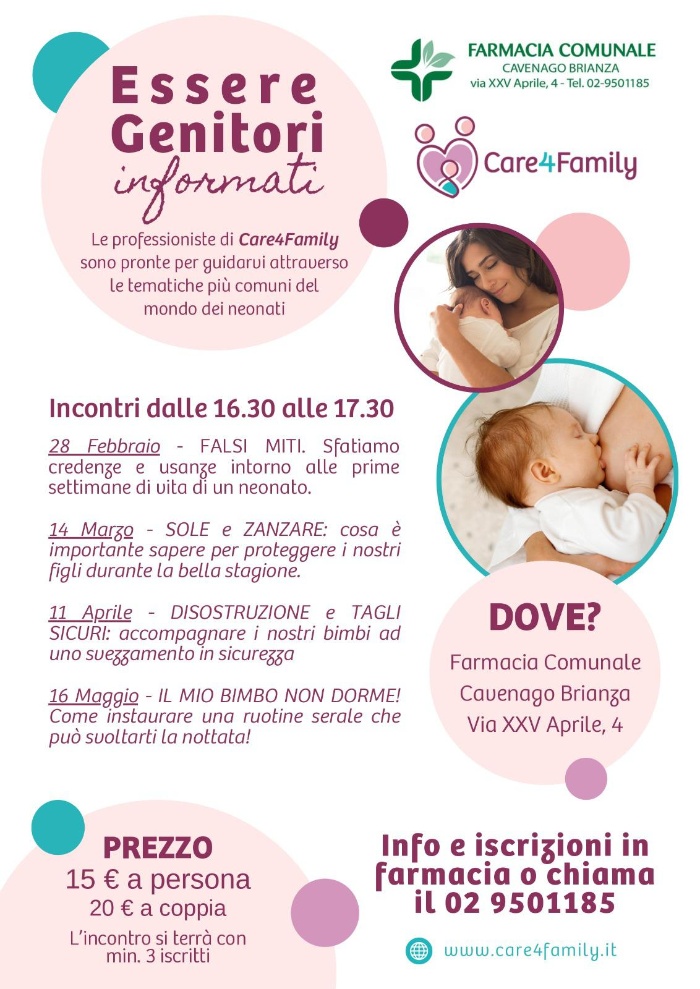 La Farmacia Comunale Cavenago di Brianza propone un ciclo di 4 incontri guidati dalle professioniste di Care4Family sulle tematiche più comuni del mondo dei neonati.