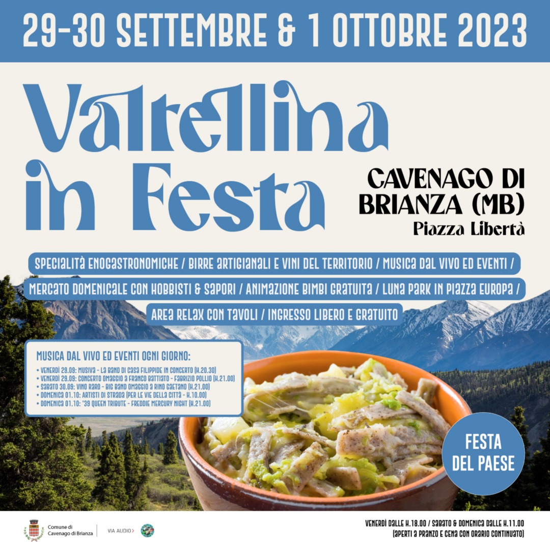 Il weekend del 29-30 Settembre e 1 Ottobre in scena il 32° Valtellina in Festa 2023 | Cavenago di Brianza (MB) per tre giornate di gusto e divertimento dedicate alla Cucina Valtellinese - in occasione della Festa del Paese, tra musica live, birre e vini selezionati, intrattenimento per i bimbi, market di prodotti tipici, luna park e molto altro - nella centrale Piazza Libertà!