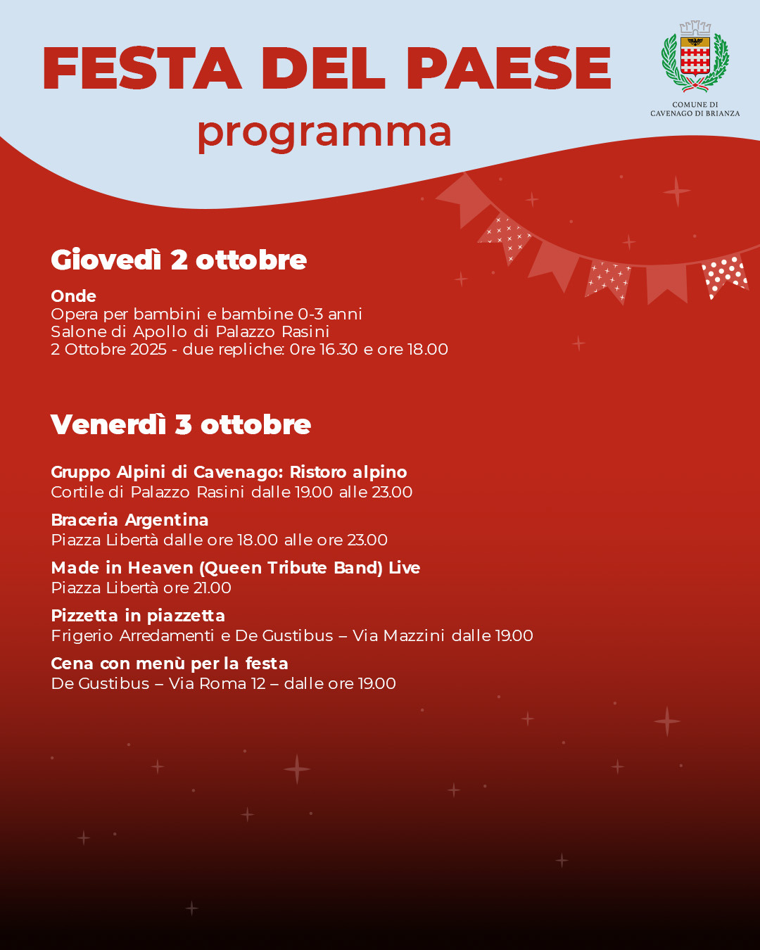 Il 3-4-5 Ottobre 2025 va in scena l'atteso weekend della Festa del Paese in Piazza Libertà a Cavenago di Brianza (MB) fra sapori e profumi argentini, con carne e verdure alla griglia, birra fresca, musica dal vivo e tanto divertimento per tutte le età!