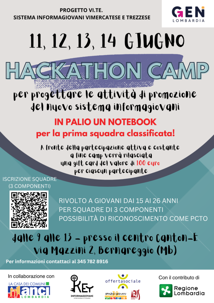 Aperte le iscrizioni, per squadre di 3 componenti, all'Hackathon Camp che si terrà dall'11 al 14 giugno presso lo spazio Canton-E nell'ambito del progetto "Vi.Te. - il Sistema Informagiovani del vimercatese e trezzese" finanziato da Regione Lombardia tramite bando "La Lombardia è dei giovani 2023".