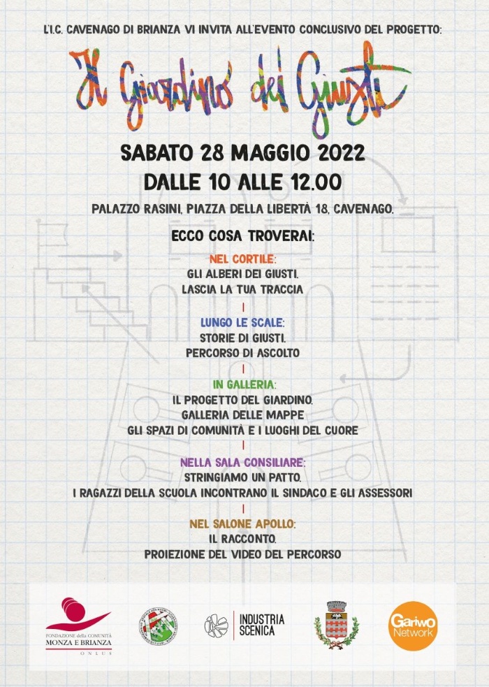 L'Istituto Comprensivo di Cavenago di Brianza invita all'evento conclusivo del progetto "Il Giardino dei Giusti". Sabato 28.05 dalle ore 10.00 alle ore 12.00 a Palazzo Rasini