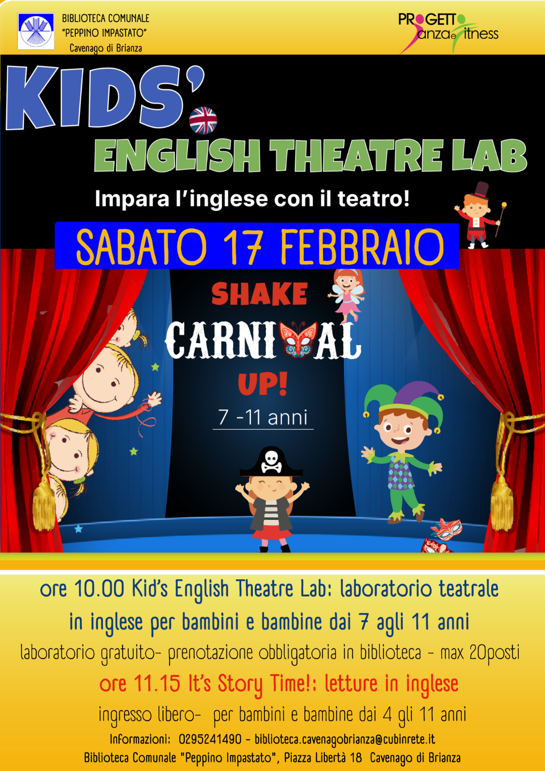 ore 10.00 Kid’s English Theatre Lab: laboratorio teatrale in inglese per bambini e bambine dai 7 agli 11 anni (laboratorio gratuito- prenotazione obbligatoria in biblioteca - max 20 posti )