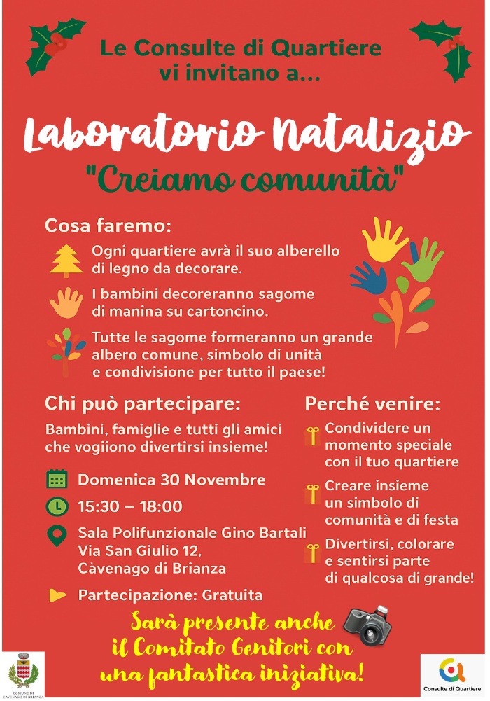 Le Consulte di Quartiere di Cavenago di Brianza invitano la cittadinanza a partecipare al Laboratorio Natalizio “Creiamo comunità”, un’iniziativa pensata per favorire creatività, collaborazione e spirito di vicinanza tra i residenti.