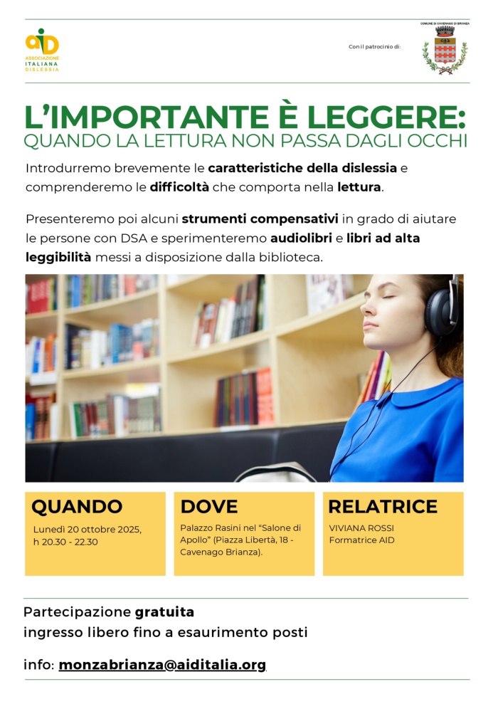 La lettura è una porta d’accesso fondamentale alla conoscenza, ma per alcuni non è così immediata. Per questo, la sezione AID di Monza-Brianza organizza in collaborazione con la Biblioteca di Cavenago Brianza una serata informativa gratuita rivolta a genitori, docenti e studenti, con l'obiettivo di approfondire il mondo dei DSA esplorando le sfide e gli strumenti che possono trasformare la lettura in un’opportunità accessibile e gratificante.