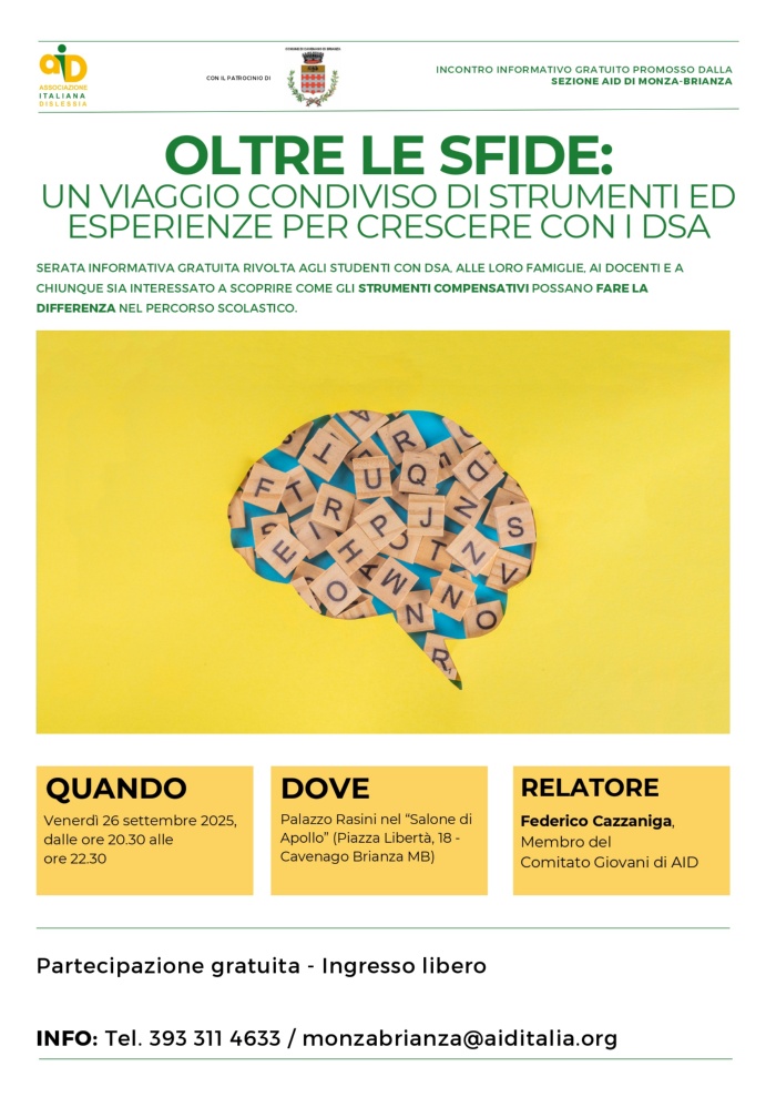 Con l'inizio del nuovo anno scolastico, la sezione AID di Monza-Brianza promuove una serata informativa gratuita rivolta agli studenti con DSA, alle loro famiglie, ai docenti e a chiunque sia interessato a scoprire come gli strumenti compensativi possano fare la differenza nel percorso scolastico.