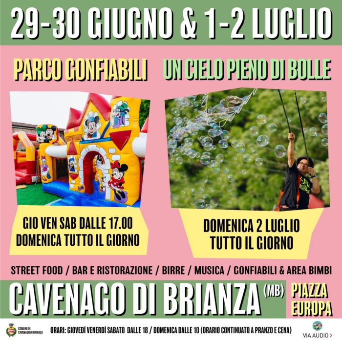 Nella giornata di Domenica 2 Luglio dalle H.10.00 per la prima volta a Cavenago di Brianza (MB) un evento magico e suggestivo, pensato per avvicinare il pubblico di tutte le età all’Arte delle Bolle di Sapone, tra teatro, clownerie, danza e arti circensi: gli artisti dell'Associazione Kervan e del Festival Nazionale delle Bolle vi accompagneranno alla scoperta delle sfaccettature di questo antico mondo che riempie il cielo di 1000 sfaccettature, con attività e spettacoli che sapranno incantare adulti e bambini in un clima gioioso!