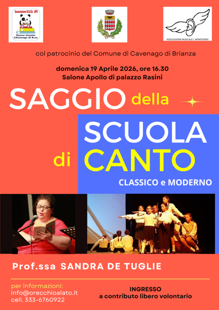 L'Amministrazione Comunale di Cavenago di Brianza è lieta di invitare la cittadinanza al Saggio della Scuola di Canto Classico e Moderno, diretto dalla Prof.ssa Sandra De Tuglie.