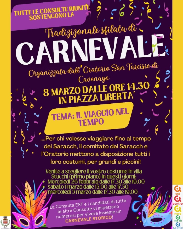 Le Consulte di quartiere invitano i cittadini a partecipare alla tradizionale sfilata di carnevale organizzata dall'oratorio San Tarcisio di Cavenago di Brianza che si terrà il giorno 8 Marzo dalle ore 14.00.