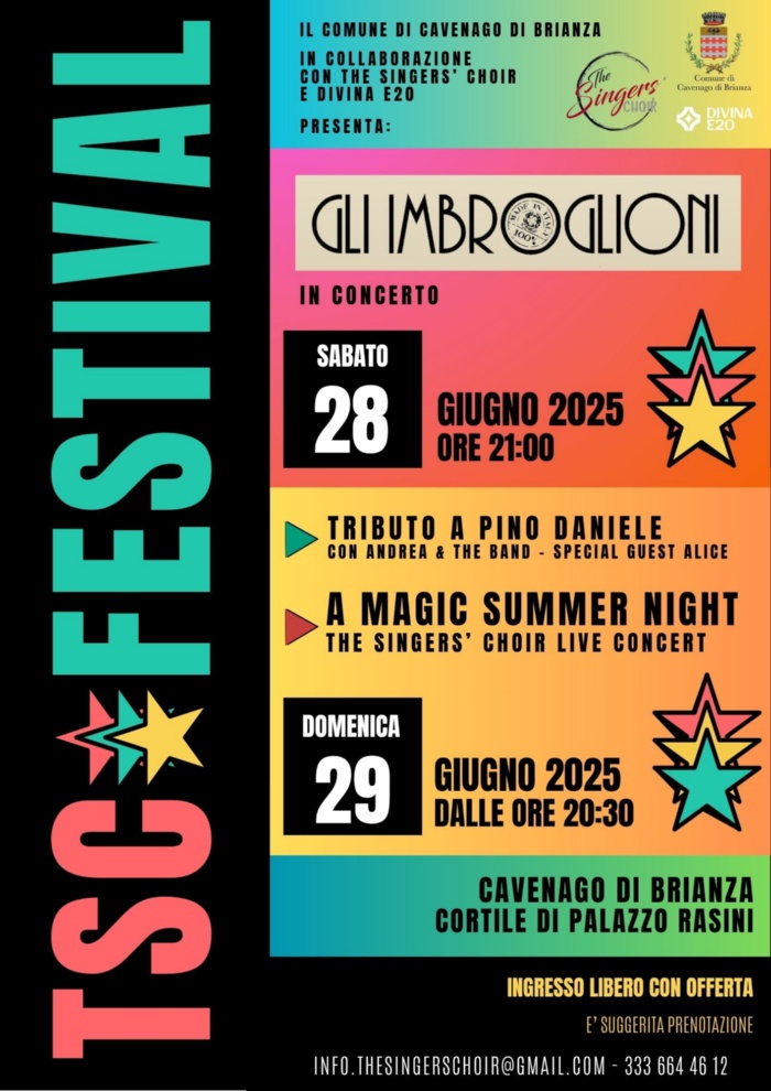 Il Comune di Cavenago di Brianza presenta il TSC Festival 2025, una manifestazione musicale che si svolgerà sabato 28 e domenica 29 giugno nel cortile di Palazzo Rasini. L’iniziativa nasce dalla collaborazione tra Divina E20 e l’associazione The Singers’ Choir APS, con l’obiettivo di valorizzare la musica dal vivo, sostenere artisti locali e offrire alla cittadinanza un’occasione di incontro e partecipazione.