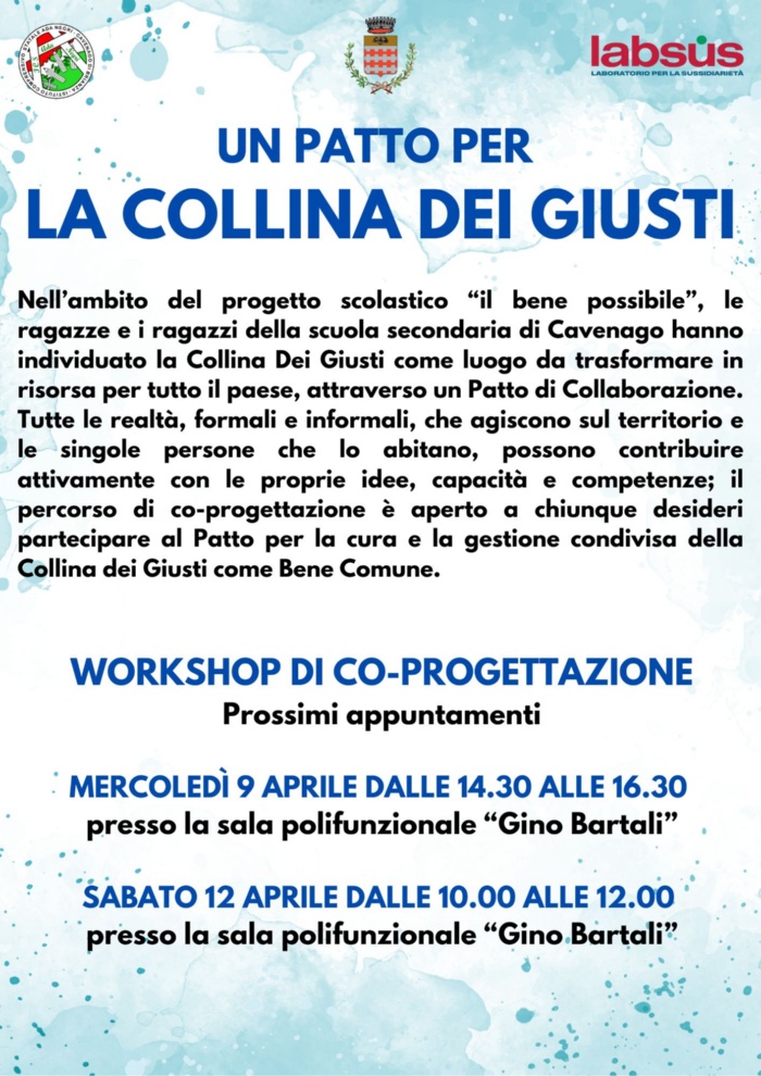 Nell’ambito del progetto scolastico “il bene possibile”, le ragazze e i ragazzi della scuola secondaria di Cavenago hanno individuato la Collina Dei Giusti come luogo da trasformare in risorsa per tutto il paese, attraverso un Patto di Collaborazione. Tutte le realtà, formali e informali, che agiscono sul territorio e le singole persone che lo abitano, possono contribuire attivamente con le proprie idee, capacità e competenze; il percorso di co-progettazione è aperto a chiunque desideri partecipare al Patto per la cura e la gestione condivisa della Collina dei Giusti come Bene Comune.